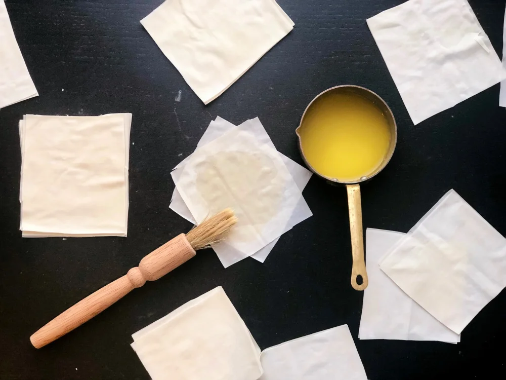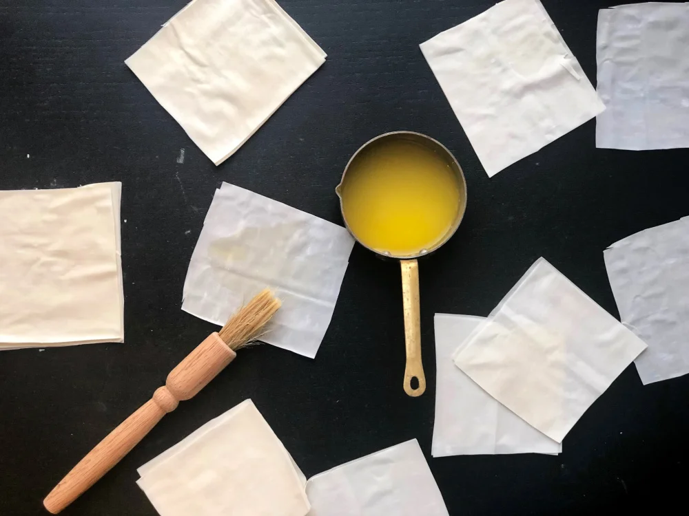 15. Brush one filo square with a little melted butter or vegetable oil.