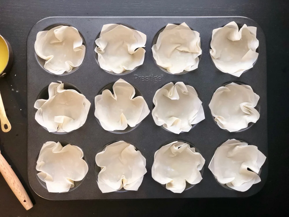21. Try to keep the mixture inside the filo cups - if they leak they could stick to the tin.