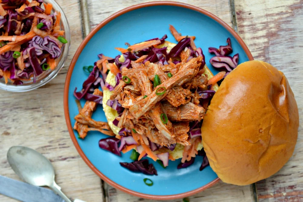 This is my go to recipe for pulled pork - a healthy, low-fat version which is easy, fool proof and very tasty. The pork is cooked in a slow cooker which makes it soft, juicy and easy to 'pull' apart. The pulled pork meat is mixed with a sweet and spicy tomato-based sauce (which is less sugary than BBQ sauce) before it's served with yummy homemade red cabbage & apple 'slaw.